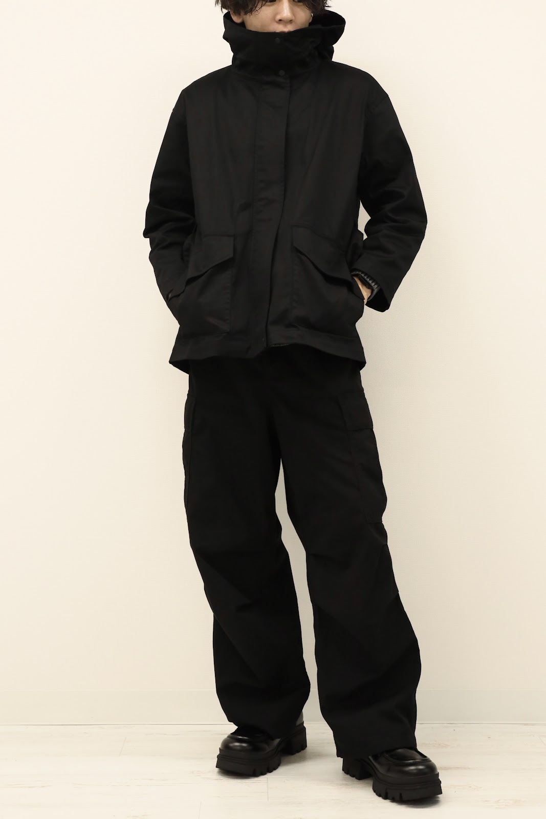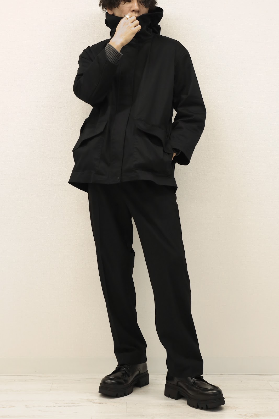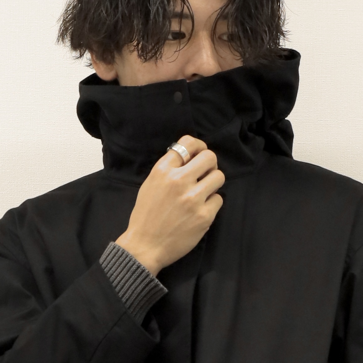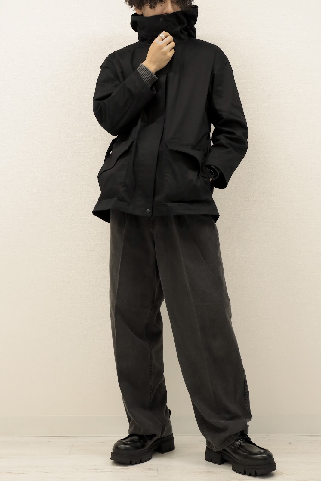 口元も覆われるのでパーカーとはまた違ったミステリアスな印象を生み出せます。