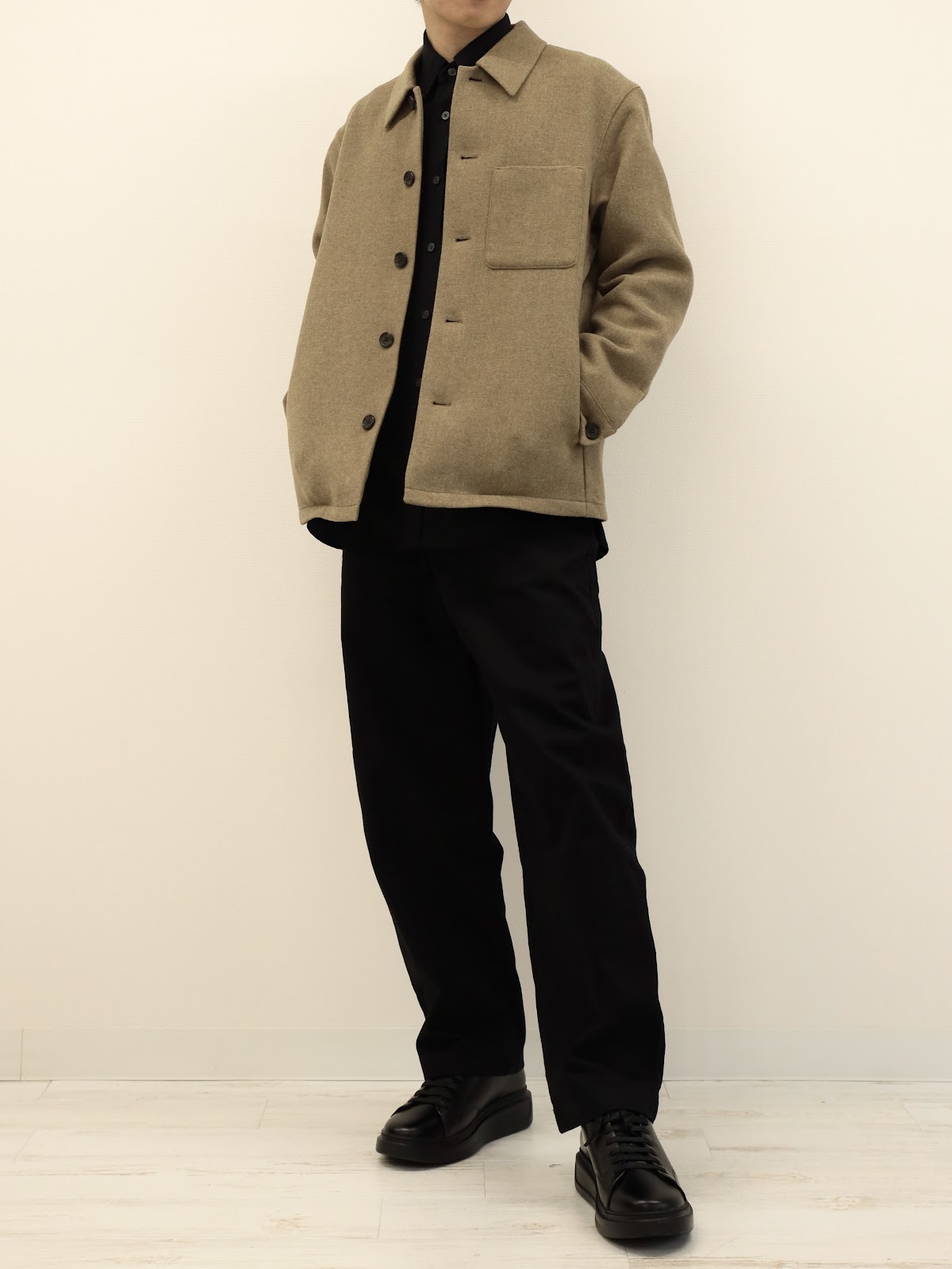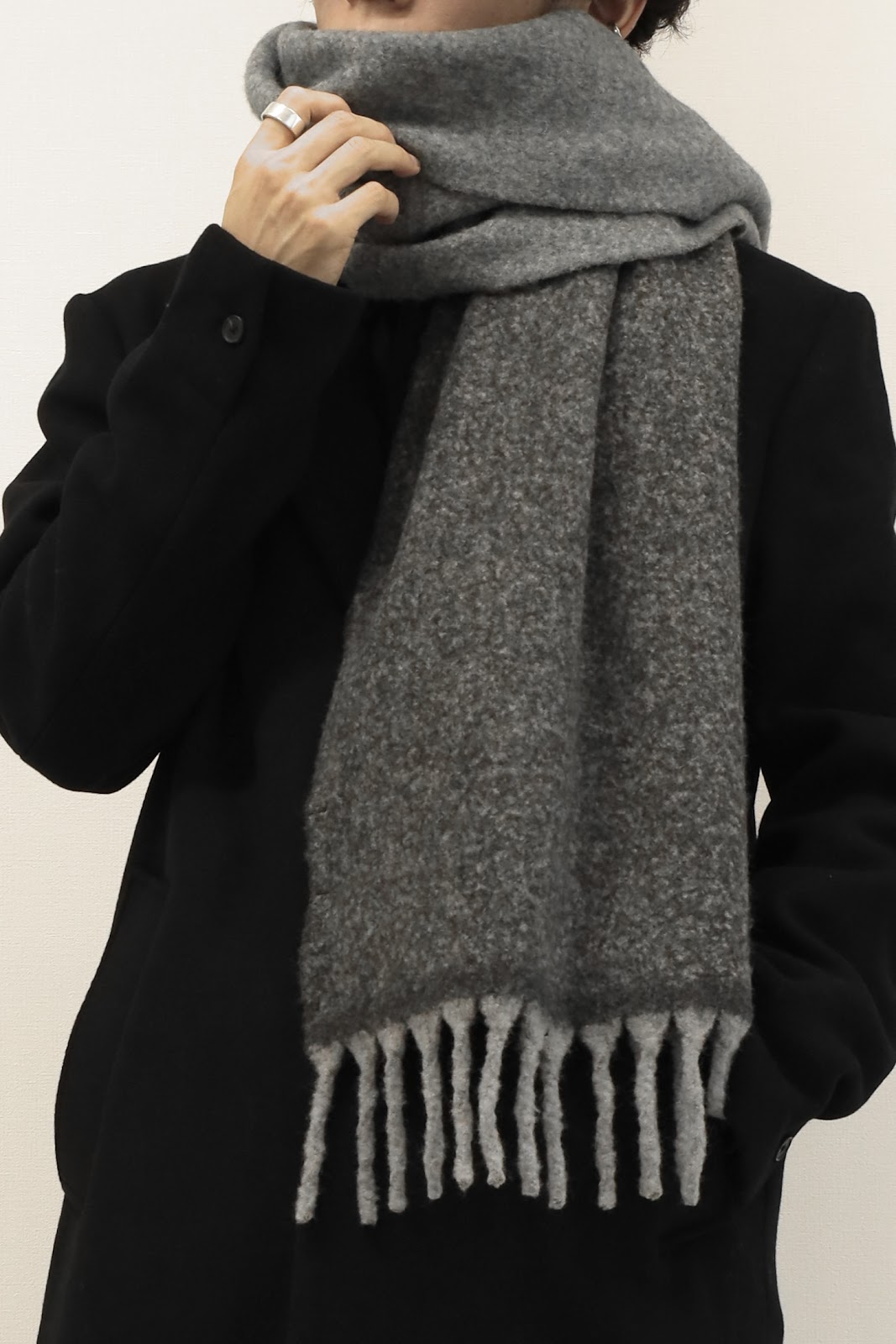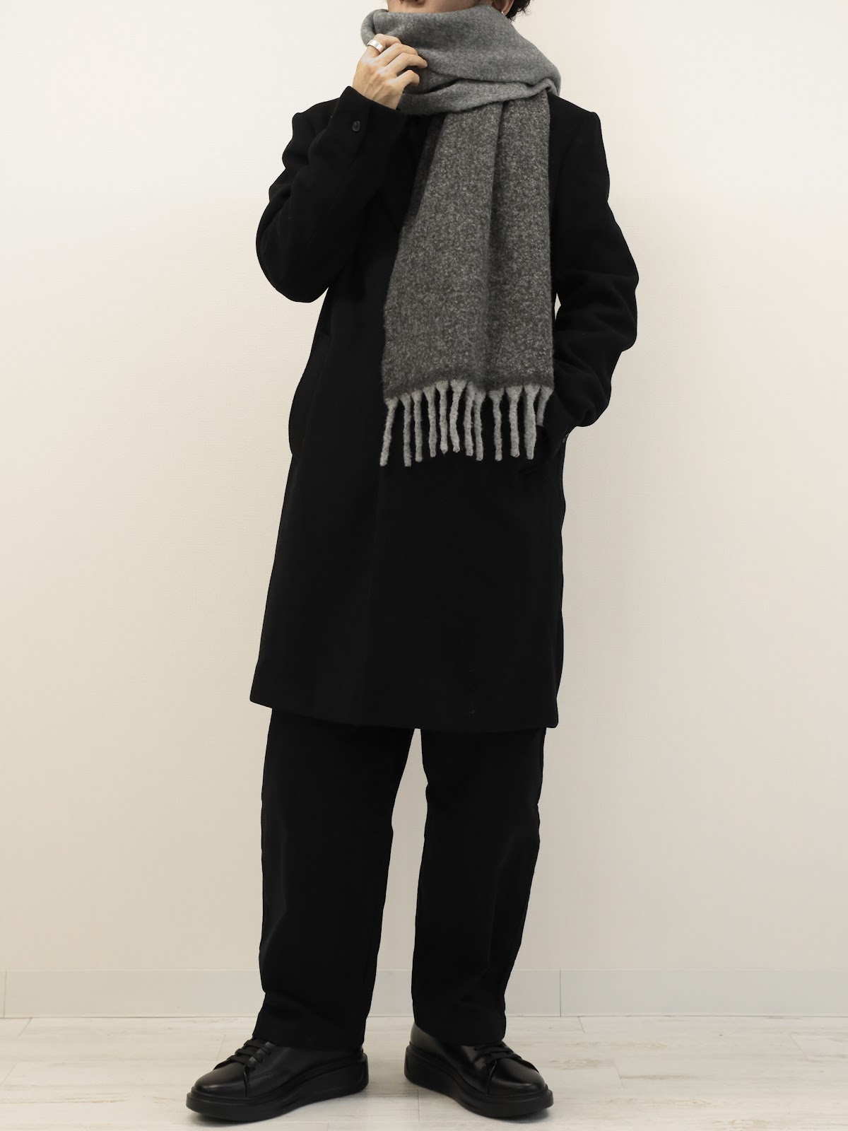 全身黒を避けたい場合はマフラー等のアイテムで差し色を入れたり、インナーの色を少し見せてあげると良いです