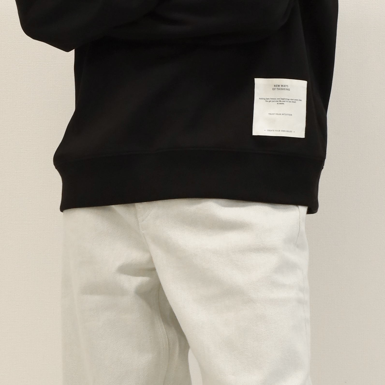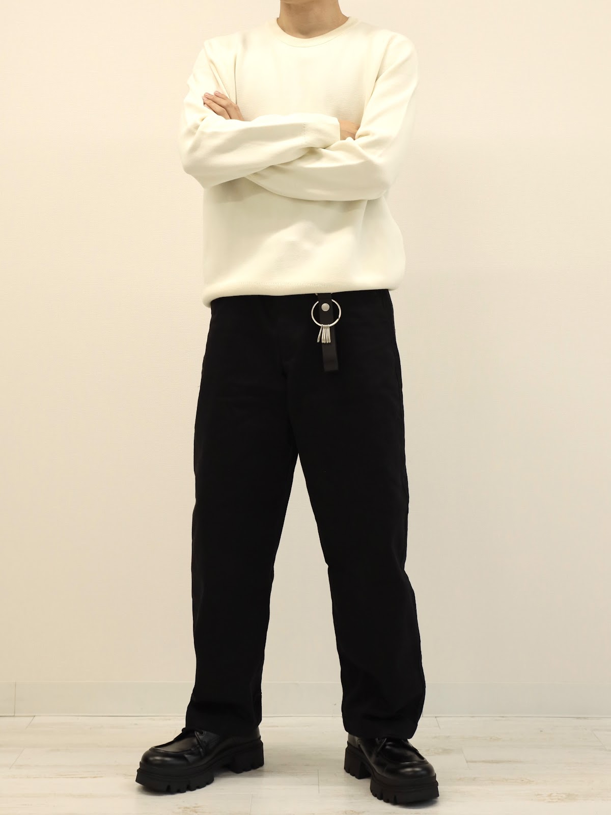 モノトーン色のパンツなら、基本何にでも合わせる事ができます。