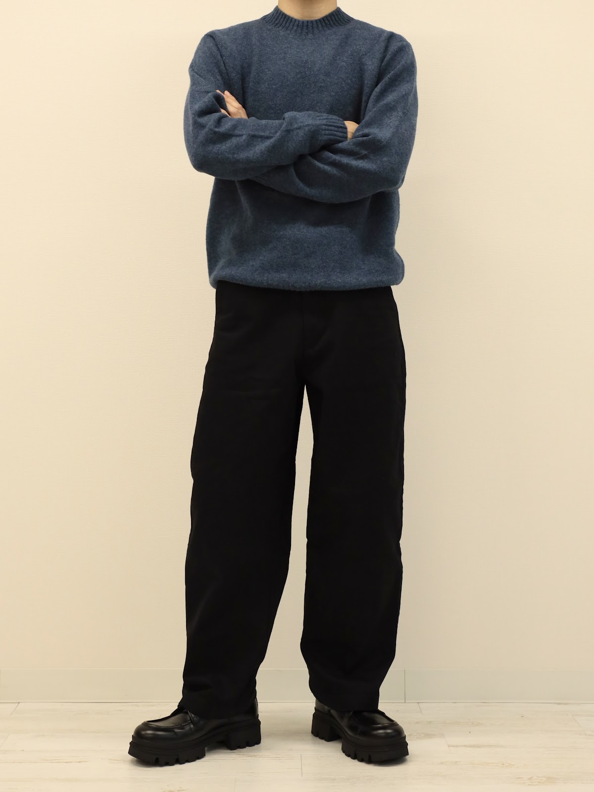 トップスとパンツ共に温かみのある生地で、コーデの相性が良い