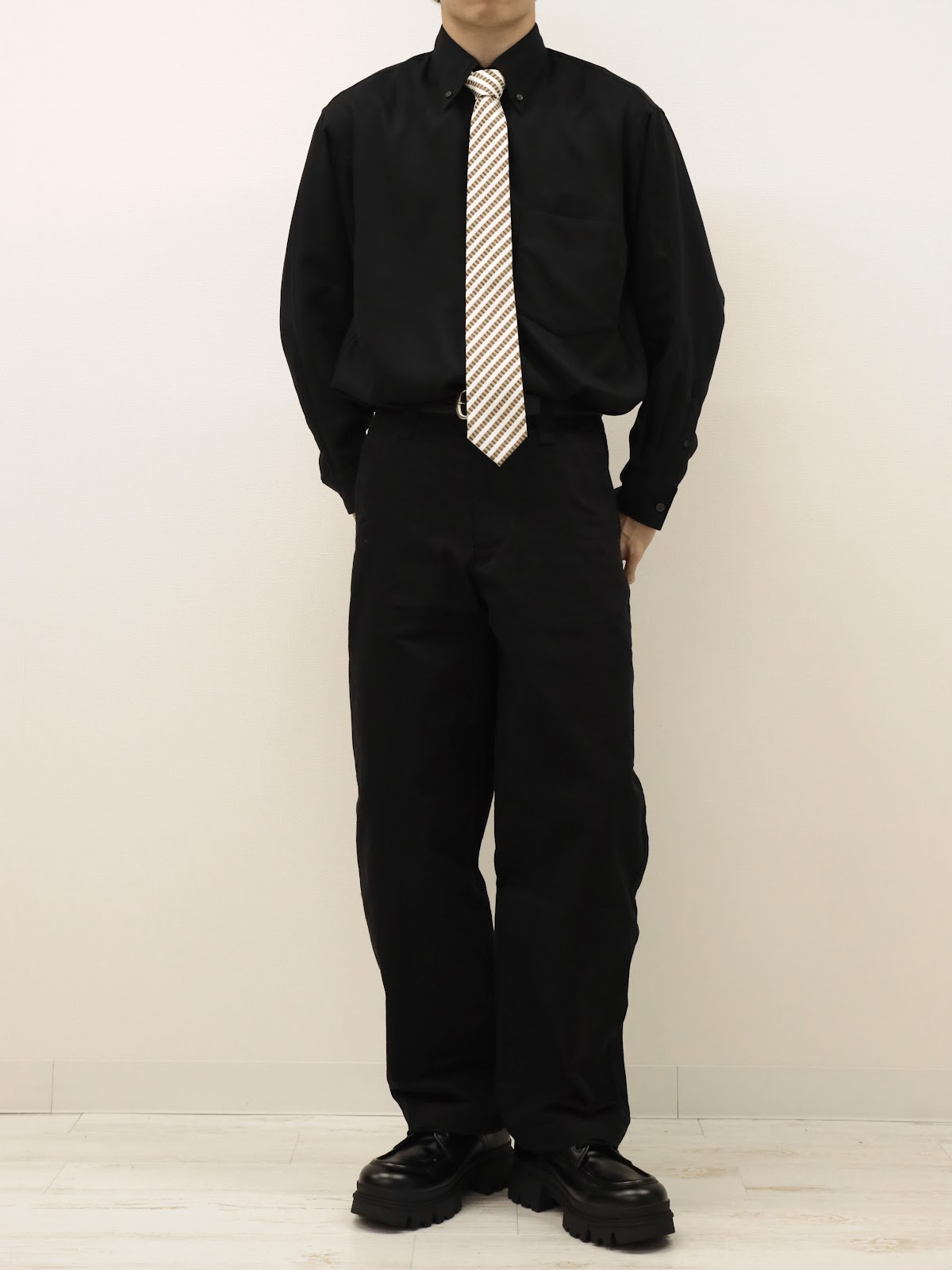 全身黒でシンプルにまとまっているのでネクタイの色や柄で遊べます。
