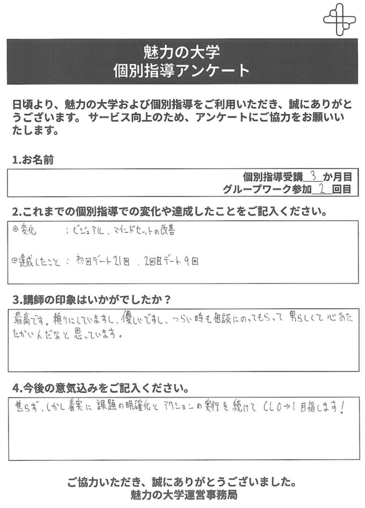 グループワーク参加回数が多くなるごとに、常に向上心を持ち続け恋愛面にとどまらず、仕事や人間関係など人生のあらゆる場面での自己成長を促しています。