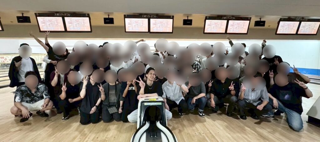 150名でボウリング場をまるごと貸し切り、5人1組のチーム戦で大会を行いました。