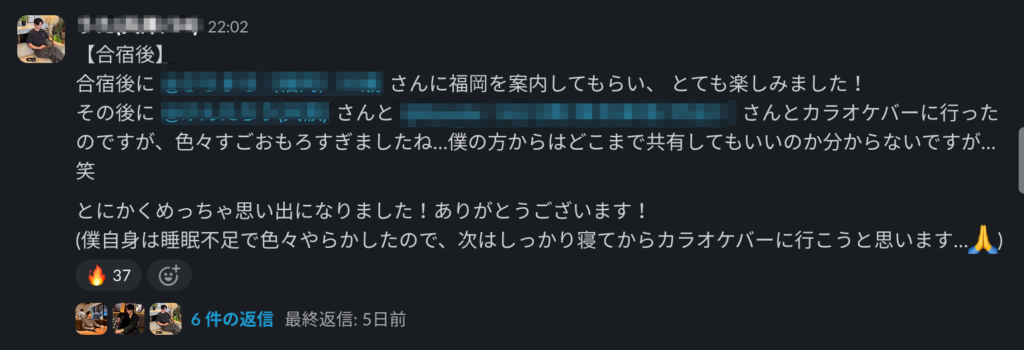 普段なかなか話せないようなことも、この場だからこそ自然に話せる。そんな濃い時間になりました。