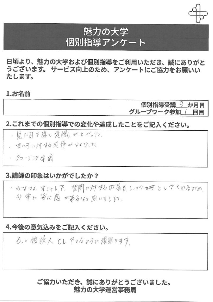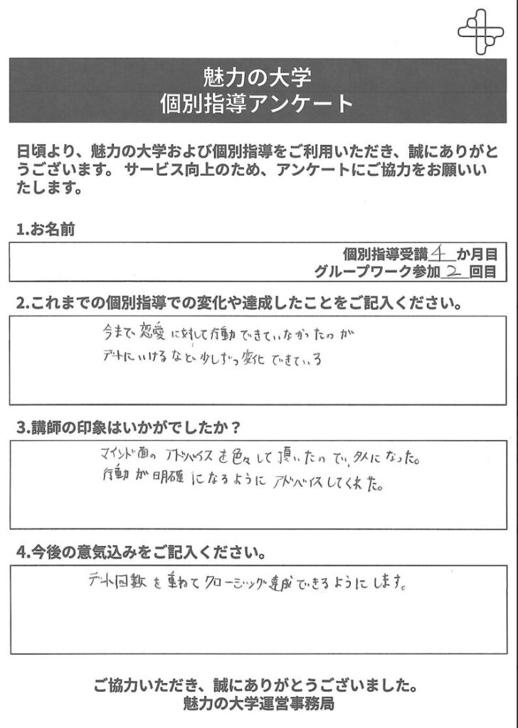 と個別指導5ヶ月目にして、総デート回数29回・音声提出回数7回と直向きに努力をされた方でした!