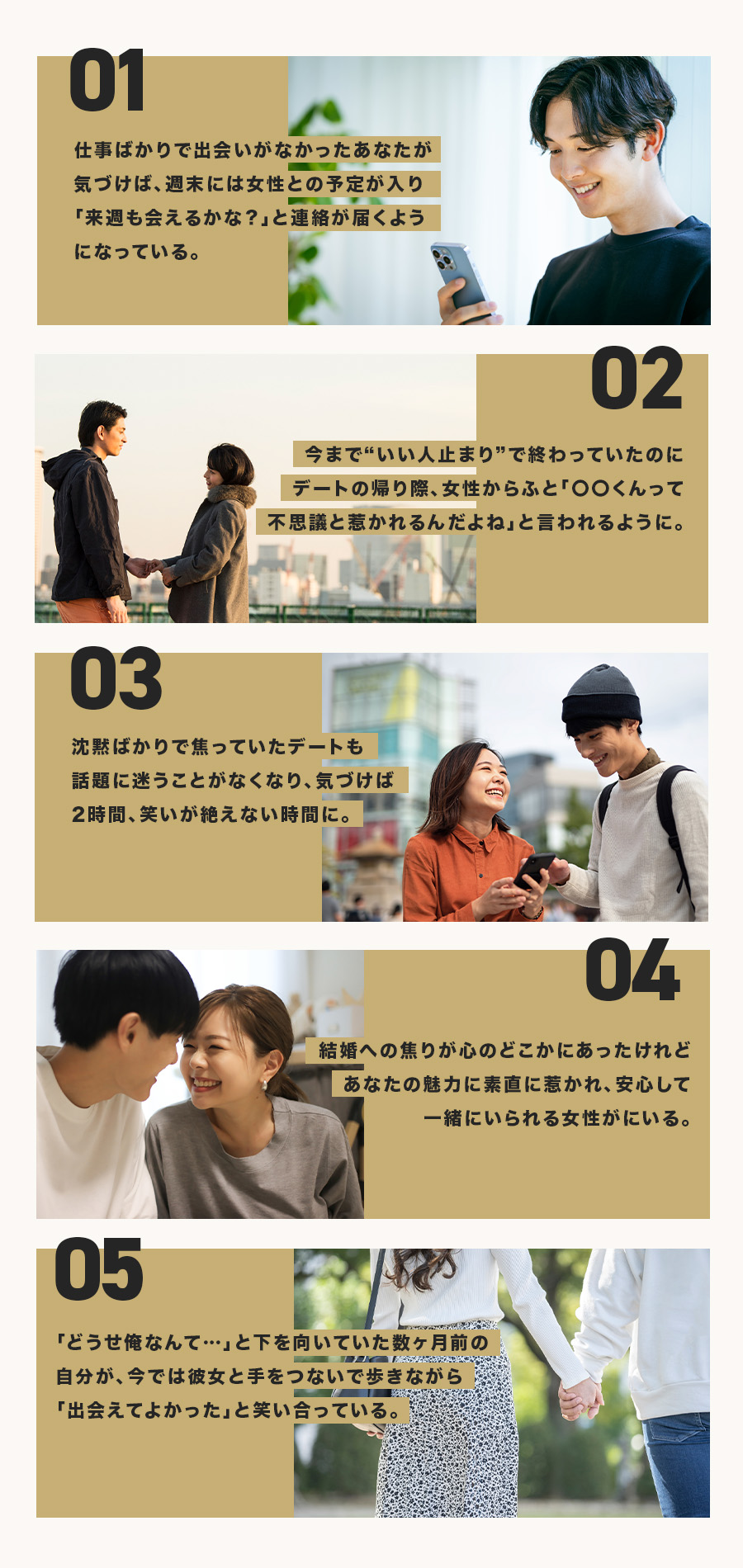 あなたの恋愛を叶えるためのコンテンツや、無料オンライン講演会、弊社サービスのご案内等を配信しております。もちろん、いつでも配信停止できます。