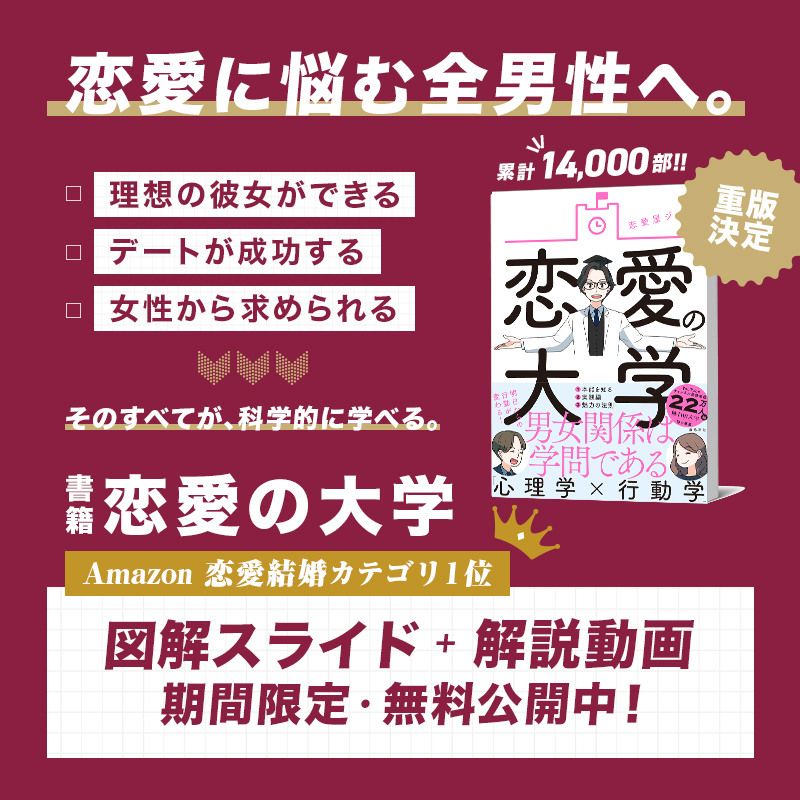 Amazon恋愛結婚カテゴリ1位の書籍「恋愛の大学」の完全図解化したスライド120枚をすべて無料プレゼント!理想の恋愛を実現するための全てのポイントを視覚的に理解できます。