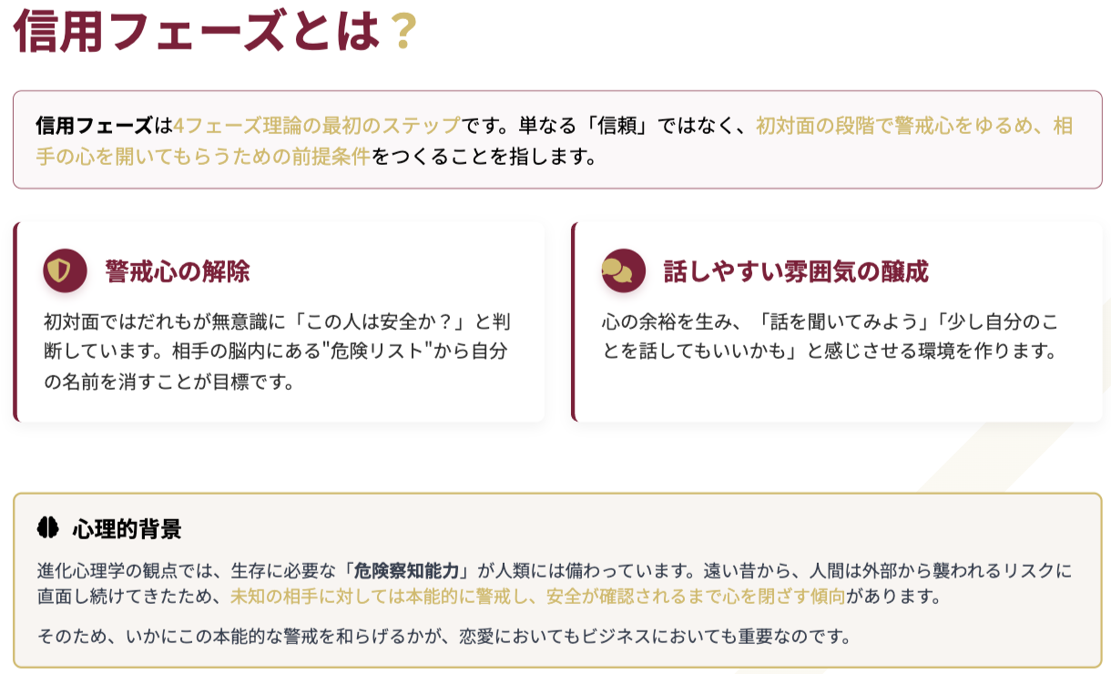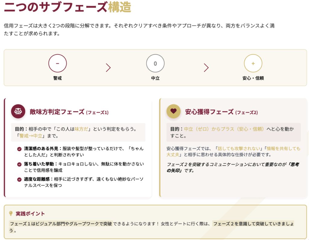 この最初の「安心できる人」だと判断してもらえる段階を【信用フェーズ】と呼びます。