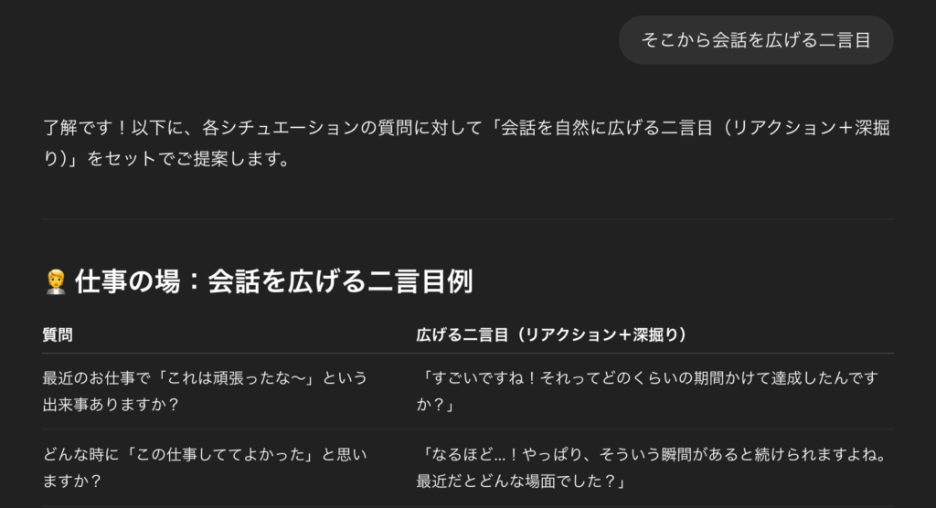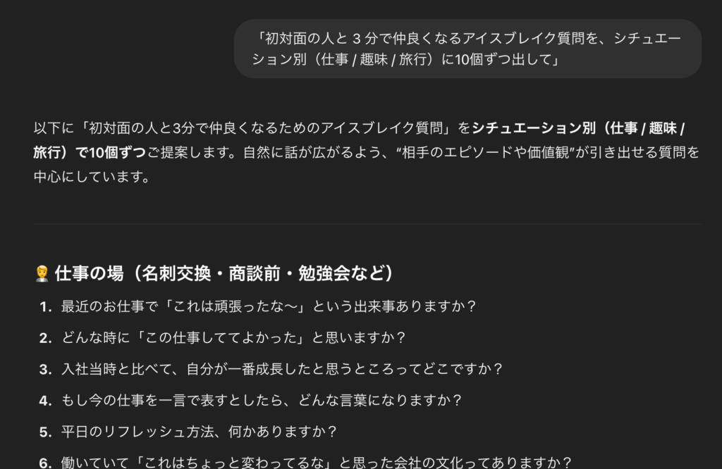 - 会話アドバイス:「初対面の人と 3 分で仲良くなるアイスブレイク質問を、シチュエーション別(仕事 / 趣味 / 旅行)に10個ずつ出してください。」